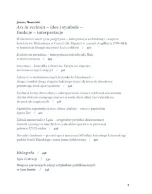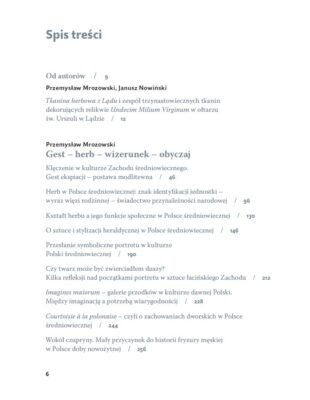 Książkę tworzą dwa bloki tematyczne poprzedzone śródtytułami, związane z profilem badań i publikacjami obu autorów. Przemysław Mrozowski: Gest – herb – wizerunek – obyczaj; Janusz Nowiński: Ars in ecclesia – idee i symbole – funkcje – interpretacje. Całość kończy bibliografia oraz spis licznych, barwnych ilustracji. Tom opracował graficznie Sławomir Krajewski, redakcję i korektę tekstu wykonała Grażyna Waluga; druk i oprawa: Drukarnia Totem.